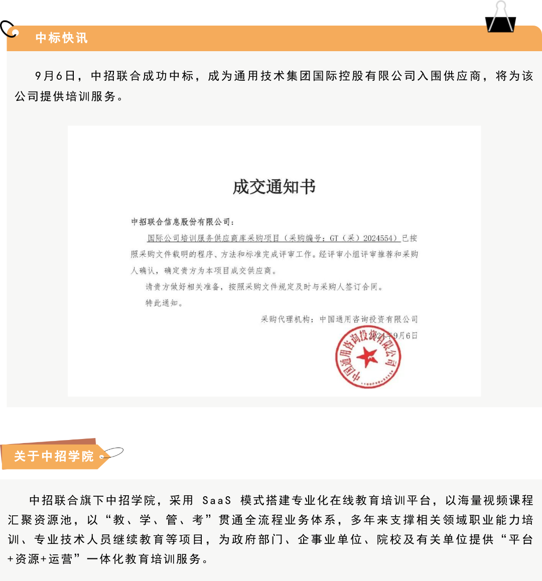 中标快讯丨中招联合入围通用技术集团国际控股有限公司培训采购项目供应商库